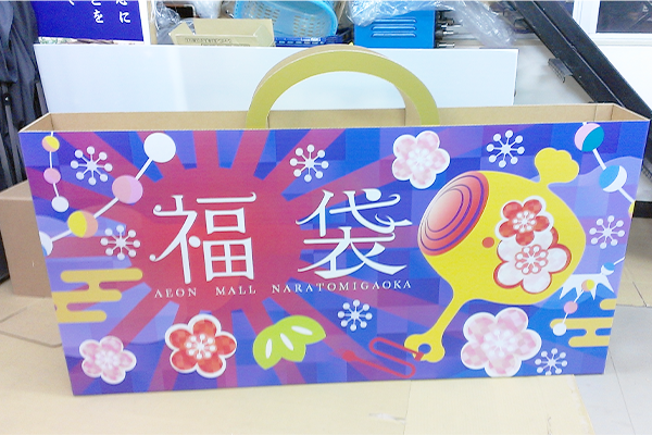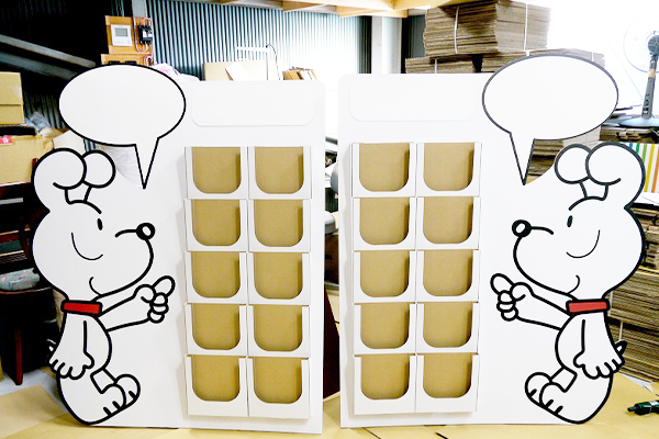 オリジナルのダンボール什器やディスプレイの制作の中では、印刷コストは非常に大きなウエイトを占めます。印刷する面積により価格差が出やすいため、費用を抑える場合には、印刷範囲を狭くするといった方法もあり、そのようなご提案をさせていただく事はよくあります。